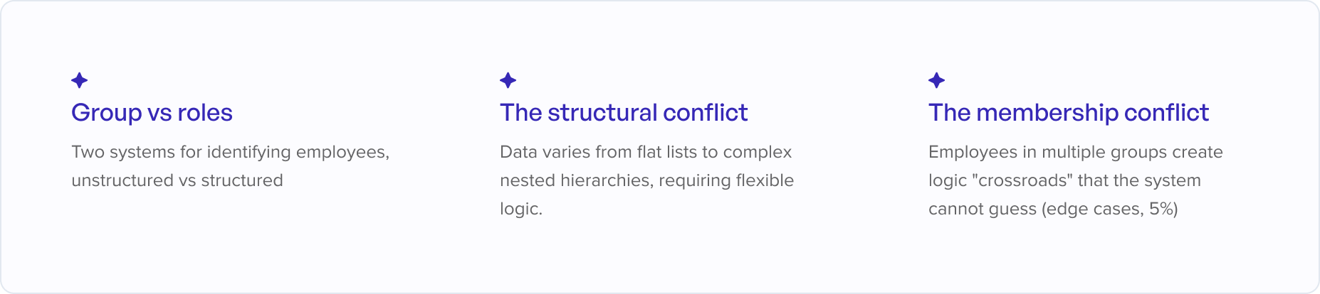 During ideation of potential solutions, the path to getting there was blocked by a fragmented data architecture. To build a system that felt simple for the user, I uncovered systemic conflicts - like Group vs. Role logic and Nested Hierarchies - that were actually causing the user's manual friction.